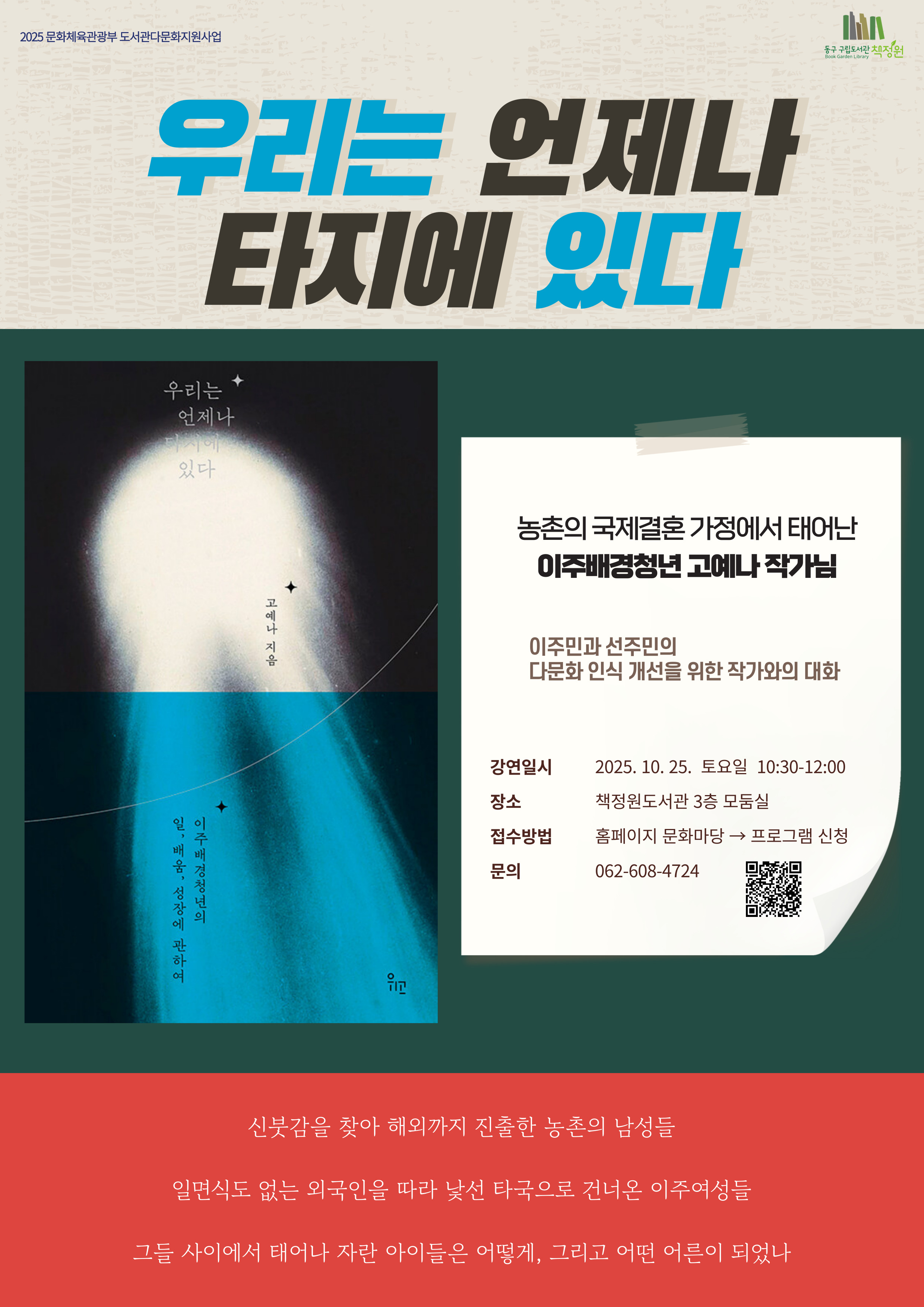 공지사항 <우리는 언제나 타지에 있다> 고예나 작가님 강연 안내 카테고리 : 책정원 조회수 : 46 * 초등학교 고학년 이상 참여하실 수 있습니다. * 프로그램 신청 : 동구 도서관 홈페이지 - 문화마당 - 프로그램 신청 고예나 작가님 강연 신청 클릭