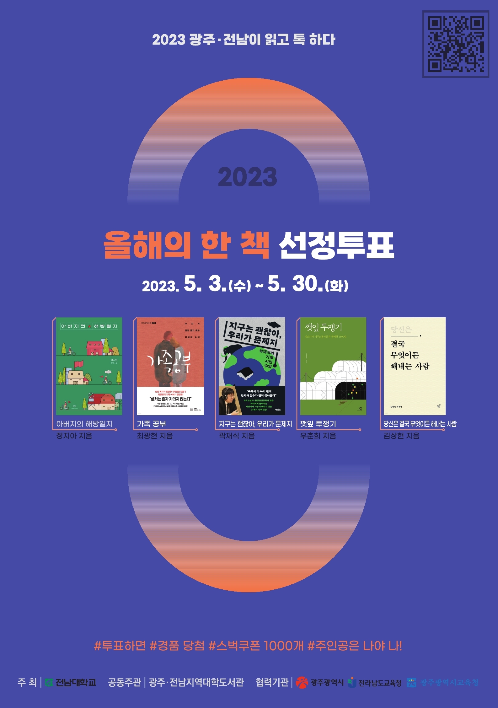 공지사항 '2023 광주, 전남이 읽고 톡하다' 안내 및 책 투표 카테고리 : 계림꿈나무 조회수 : 2525 첨부파일 '2023 한 책 선정투표' 포스터.jpg (734.05 KB) ※ 2023년 한 책 선정 온라인 투표 : http://gjtalk.jnu.ac.kr