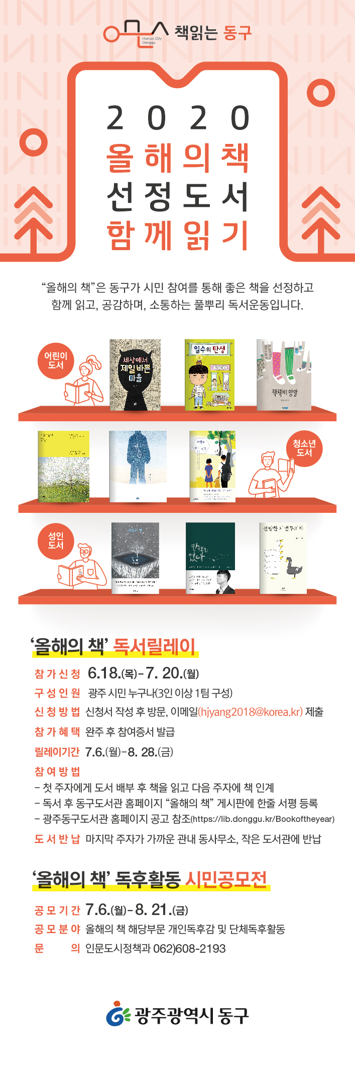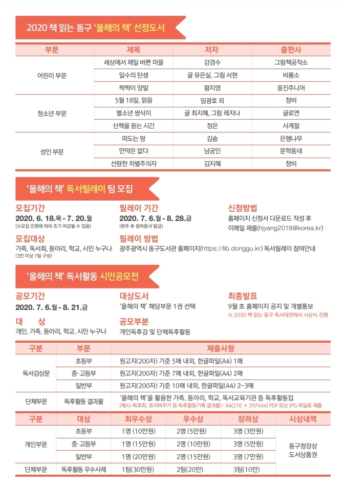 공지사항 2020 책 읽는 동구 올해의 책 독서문화 프로그램 카테고리 : 계림꿈나무 조회수 : 3660 첨부파일 인문도시_독서프로그램 전면.jpg (678.71 KB) 첨부파일 인문도시_독서프로그램 후면.jpg (349.37 KB) 첨부파일 1.올해의 책 독서감상문 공모신청서(개인).hwp (31.50 KB) 첨부파일 2.올해의 책 단체독후활동 참가신청서.hwp (36.50 KB) 올해의 책 독서문화 프로그램 시민공모전 모집기간이 8.28(금)까지 연장되었습니다.