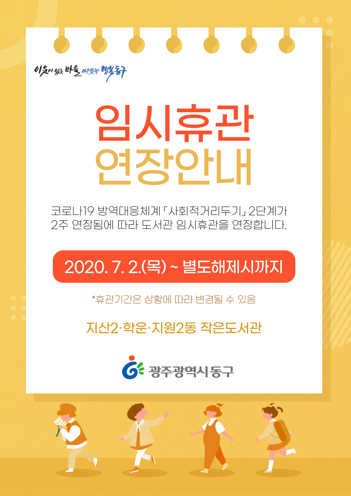 공지사항 동구 구립작은도서관 임시휴관 연장 안내 카테고리 : 계림꿈나무 조회수 : 2192 첨부파일 작은도서관-휴관-1 (1).png (797.63 KB) 동구 구립 작은도서관 임시휴관 연장