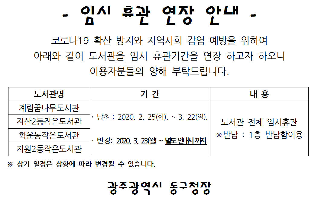 공지사항 동구 공공 및 공립작은 도서관 휴관 연장 안내 카테고리 : 계림꿈나무 조회수 : 2316 첨부파일 임시 휴관 연장 안내.PNG (36.38 KB) 동구 공공 및 공립작은 도서관 휴관 연장 안내