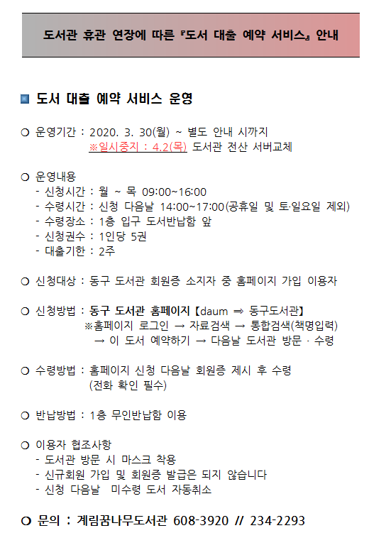 공지사항 휴관기간중 도서 대출 예약 서비스 안내 카테고리 : 계림꿈나무 조회수 : 2362 첨부파일 도서예약대출서비스 운영 안내-임시휴관기간중.PNG (33.52 KB) 도서관 휴관 연장에 따른 도서 대출 예약 서비스 운영